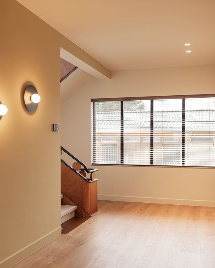 - Subtiele contrasten tussen muren, trap en leuning