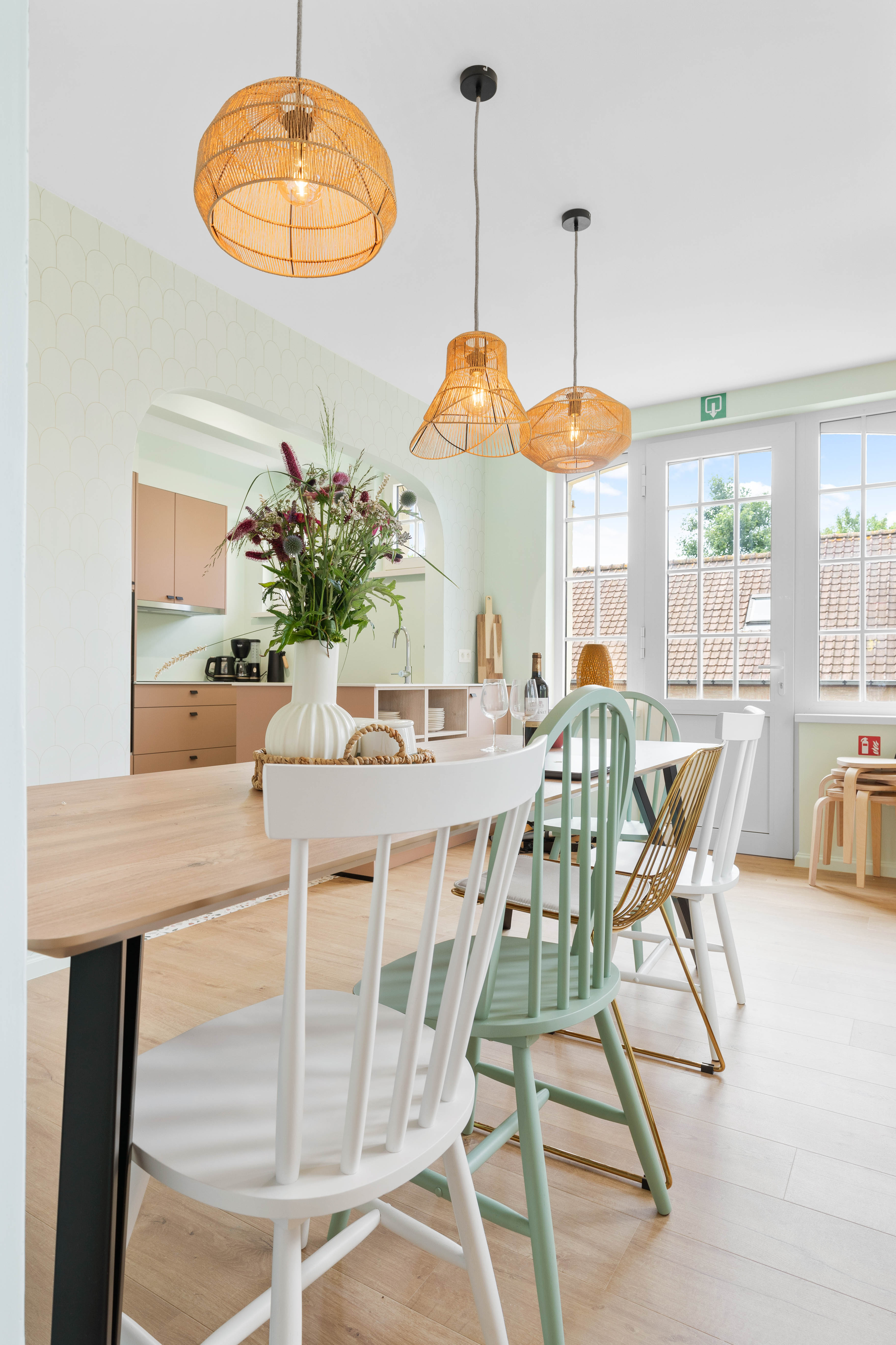 De keuken is volledig uitgerust met moderne toestellen en alle kookgerei, ideaal om zonder zorgen samen te koken. Dankzij de praktische indeling en ruime werkbladen is er plaats genoeg om met meerdere mensen tegelijk aan de slag te gaan. De keuken sluit naadloos aan bij de lange eettafel, wat uitnodigt tot gezellige ontbijtjes, lange diners of een aperitief terwijl er gekookt wordt.