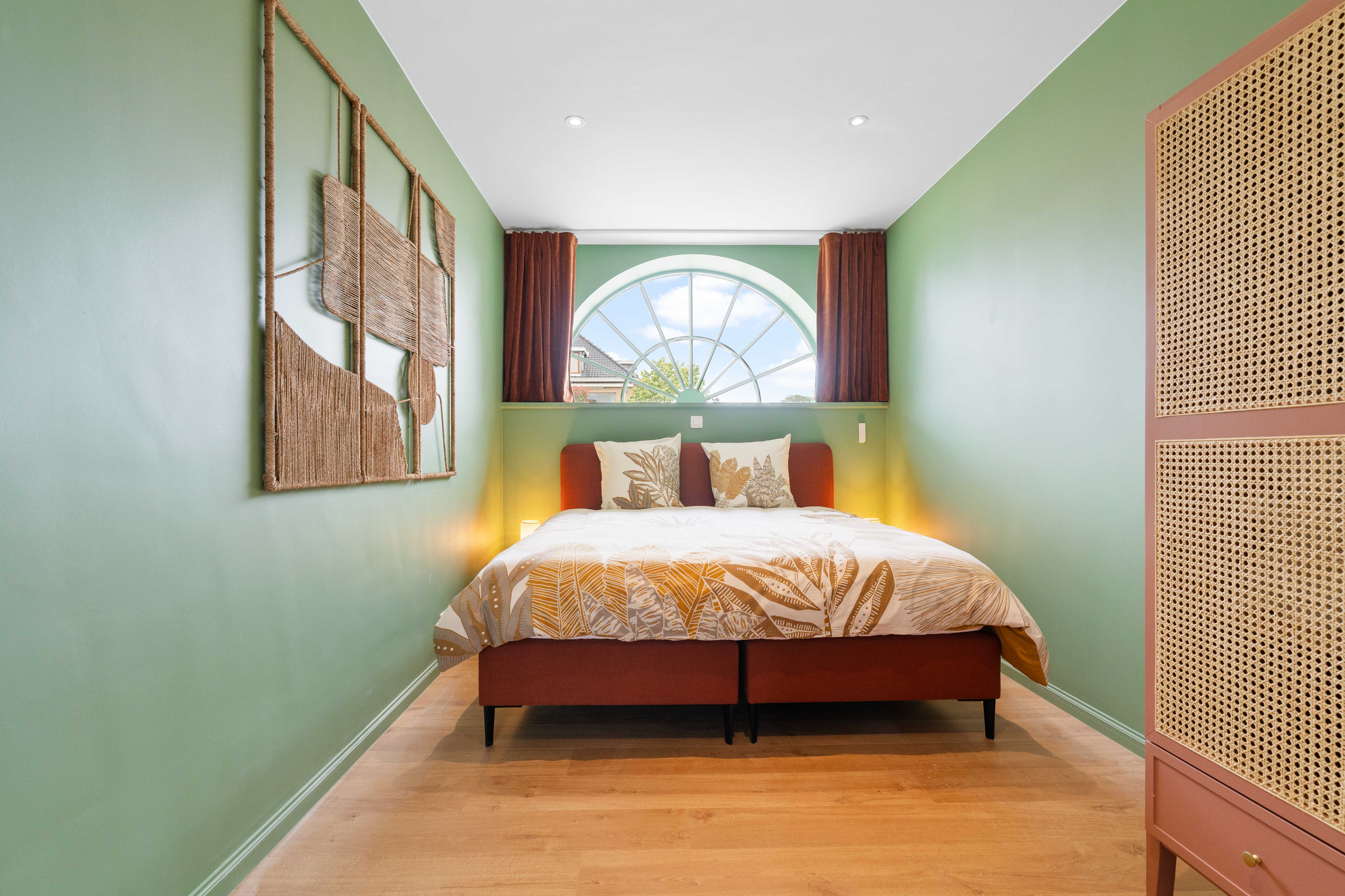De slaapkamers vormen een rustige en stijlvolle oase, waar comfort, sfeer en elegantie samenkomen. Ze zijn ingericht met zachte, harmonieuze tinten zoals Vintagegroen, Marrakechblauw en Vanillewit, subtiel aangevuld met speelse en warme accenten van Wangenroze, Perzikoranje en Aquamarijnblauw. Voor een frisse, levendige toets zorgen nuances van Dauwblauw, Egyptisch blauw, en Cyaanblauw.
