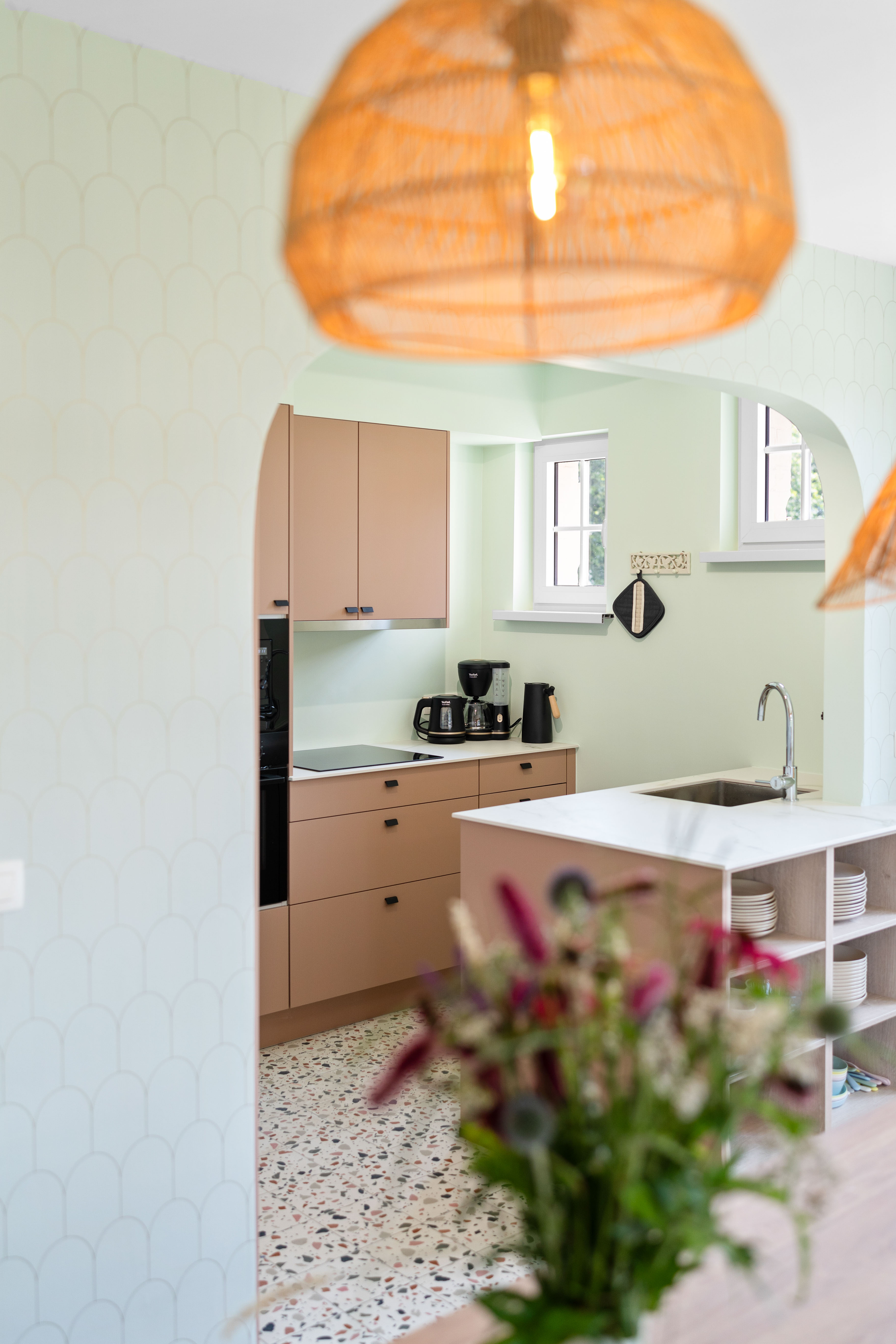 De keuken straalt pure charme uit en vormt het kloppend hart van het huis. De serene sfeer ontstaat door een palet van Muntwit, Ivoorwit en Sisalbeige, verfijnd met een toets Schaduwgrijs. Deze harmonieuze combinatie brengt frisheid, warmte en elegantie in balans. Hou je van een warme uitstraling, ga dan voor zulke zachte tinten en natuurlijke accenten. Zo laat je je ruimte meer uitnodigend voelen.